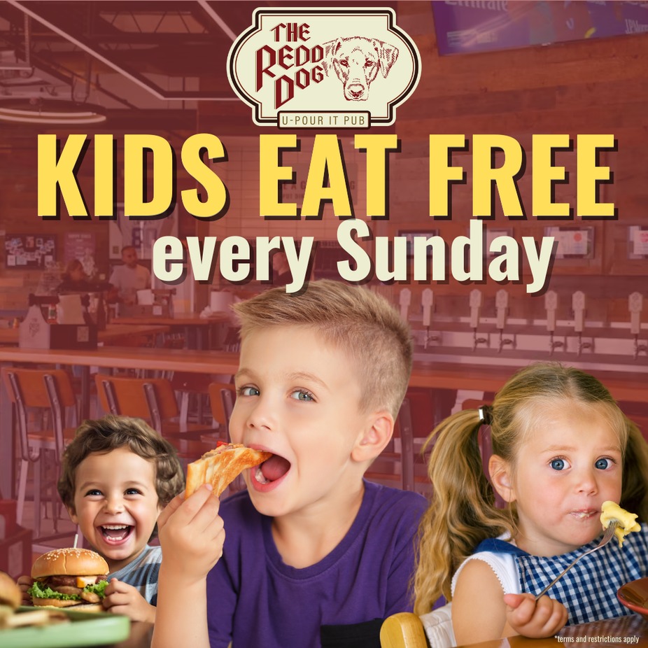 Kids Eat Free every Sunday! Sundays just got more family-friendly at The Redd Dog š¶š½ļø Bring the pups (the human kind!) and enjoy a FREE Lilā Pups entrĆ©e for kids 12 & under with any $25 food purchase. Dine-in only. Promo code required. Not valid with other discounts.