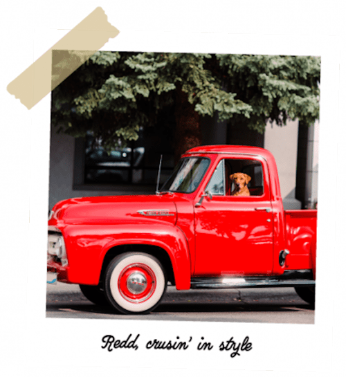 When Redd is not in his pub, he is on the road... windows down, music up. He's a fan of camping in Montana and has only seen a bear once on his hikes. Redd lives for your attention and will tap you with his nose when he needs you to look down... Interpretation: love me, pet me and most importantly feed me. Speaking of food, Redd's favorite treats are apples and carrots, and insists he was a vegan in his past life. Redd thinks dog beds are for the dogs and hogs the bed at night. But hey, he's the top dog now.